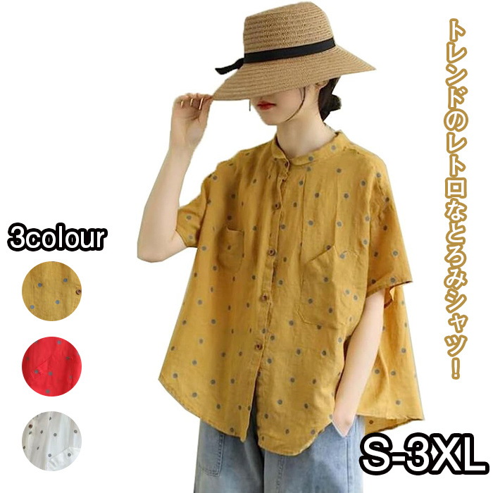 レディース 半袖 ブラウス ドット柄 シャツ カットソー トップス 立つ襟 チュニック おしゃれ オフィス カジュアル エレガント ヴィンテージ 夏 秋 大きいサイズ 可愛い S-3XL