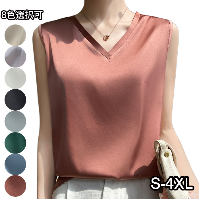 シャツ ブラウス レディース ノースリーブ トップス Vネック 8色 サテン 光沢感 接触冷感 肌触り良い 薄手 着回し力 可愛い プルオーバー 着痩せ 抜け感 快適 通勤 OL 夏 S-4XL