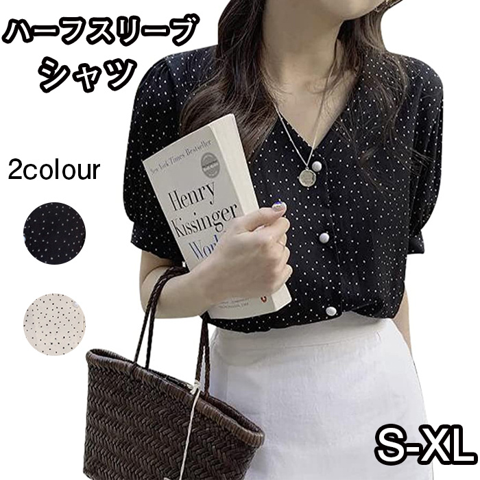ハーフスリーブ ドット ブラウス パールボタン Vネック 半袖 シャツ レディース 春夏服 S~2XL