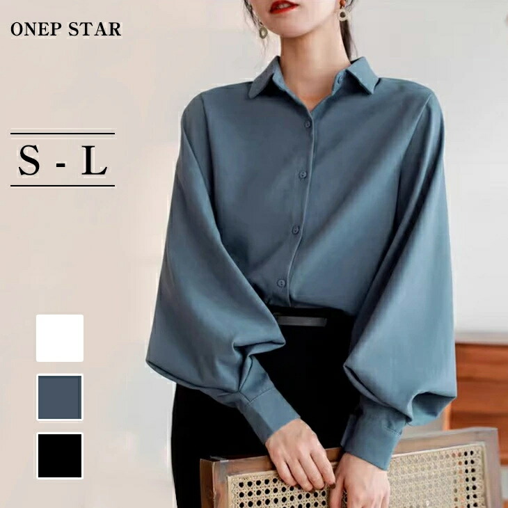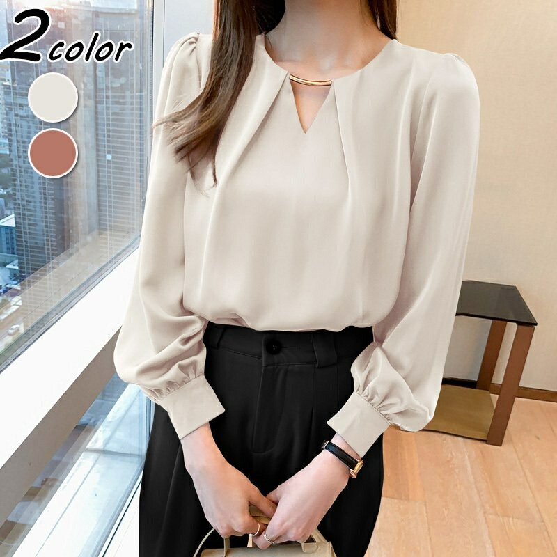 シンプルなブラウスだけどぽわんとした袖で甘さプラス 長袖トップス 無地 シンプル きれいめ ぽわん袖 30代 40代 50代 60代
