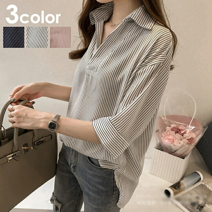 シャツ ブラウス ストライプ かっこいい ロング 大きいサイズ 大人 マニッシュ ネック トップス 半袖 韓国 5分袖 ボーダー 通勤 ビジネス オフィス 抜け感 涼しい