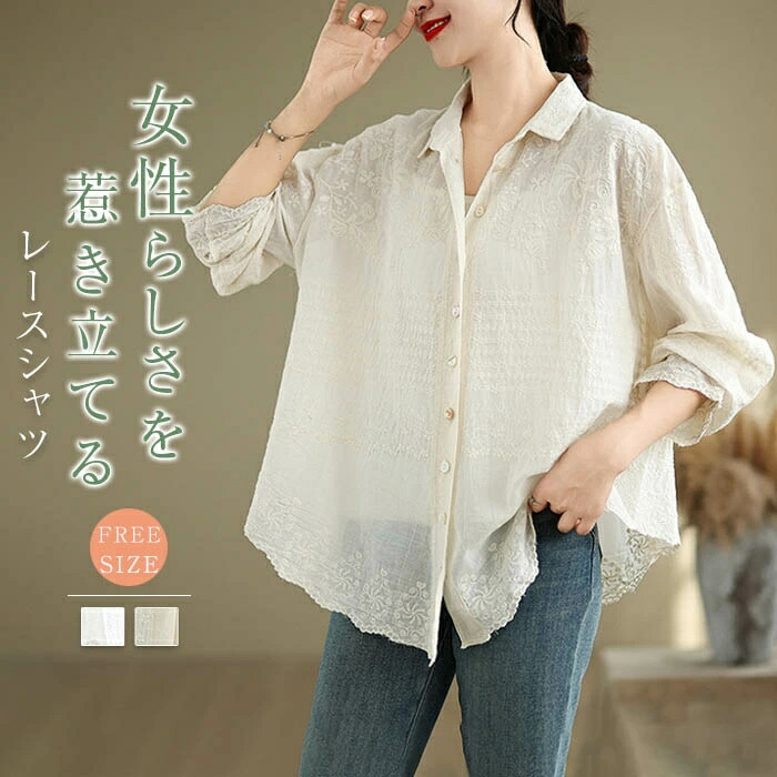 花柄刺繍 レース シャツ ブラウス チュニック 長袖 前開き カーデ 春秋 フェミニン 紫外線対策 冷房対策 日焼け止め