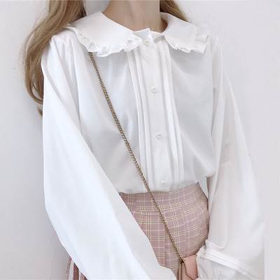 トップス レディース ブラウス 個性的 長袖 襟付き 丸襟 フリル 無地 白 黒 S M L 春 夏 秋 上品 きれいめ おしゃれ シンプル カジュアル ナチュラル フェミニン 大人可愛い