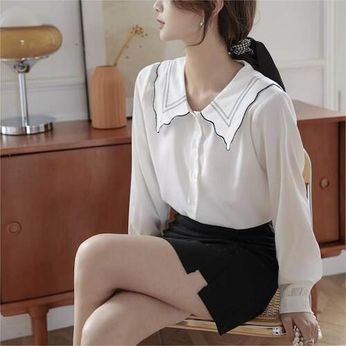 トップス レディース 長袖シャツブラウス 襟付き ビッグカラー シフォン 大人可愛い きれいめ シンプル シック 大人 上品 おしゃれ お洒落 かっこいい レトロ 大人女子 エレガント 存在感