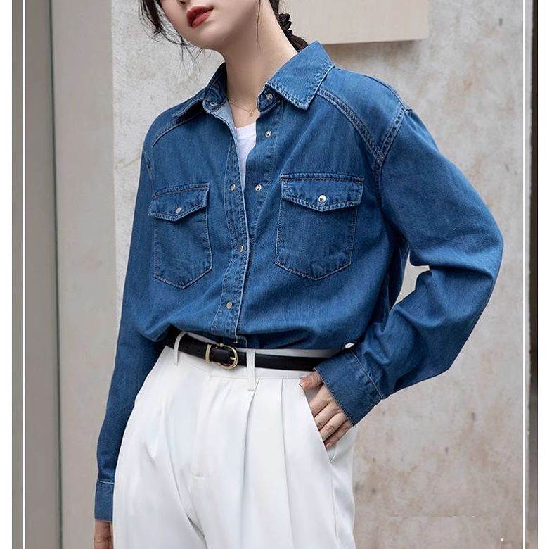 トップス アウター レディース デニムシャツ ブラウス 羽織り ジャケット 長袖 スナップボタン 襟付き ポケット 前開き ドロップショルダー 大人可愛い シンプル カジュアル ベーシック