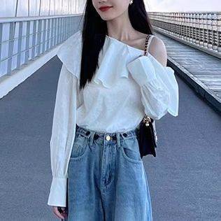 トップス レディース ワンショルダー 長袖ブラウス プルオーバー フリル襟 大人可愛い きれいめ シンプル 大人 上品 おしゃれ お洒落 かっこいい 大人女子 フェミニン エレガント