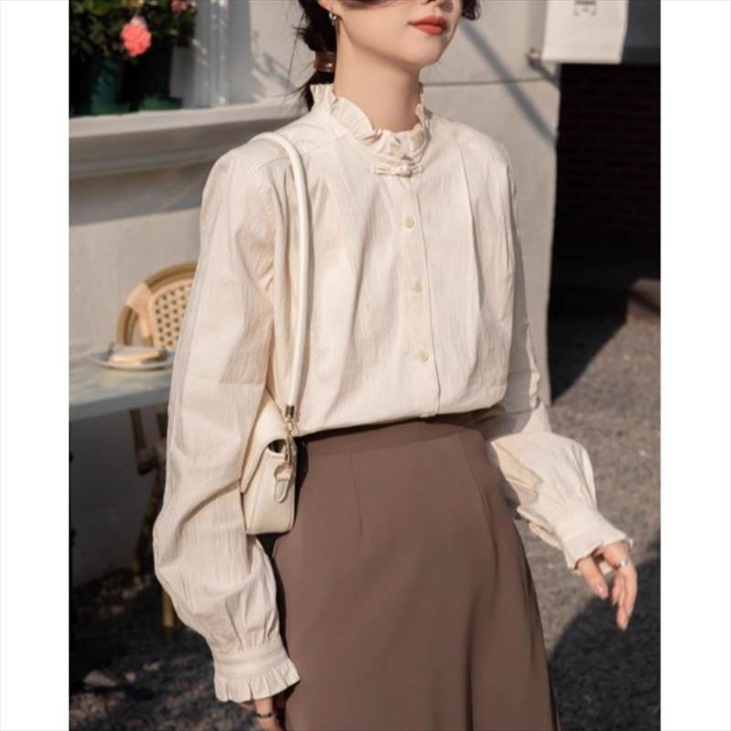トップス レディース 長袖シャツブラウス 襟付き スタンドカラー 立襟 フリル襟 キャンディスリーブ タック アジアンノット 大人可愛い きれいめ シンプル シック 大人 上品 おしゃれ