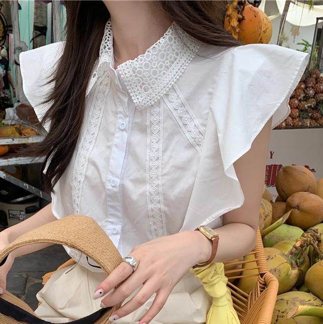 トップス レディース シャツブラウス 襟付き フリル袖 フレアスリーブ 半袖 レース 大人可愛い きれいめ カジュアル 大人 上品 おしゃれ お洒落 大人女子 エレガント フェミニン 存在感