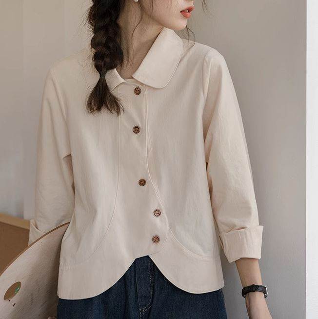 トップス レディース シャツブラウス 襟付き 長袖 アシンメトリー ボタン ハンカチヘム 大人可愛い シンプル カジュアル 大人 上品 おしゃれ お洒落 大人女子 レトロ 存在感 抜け感
