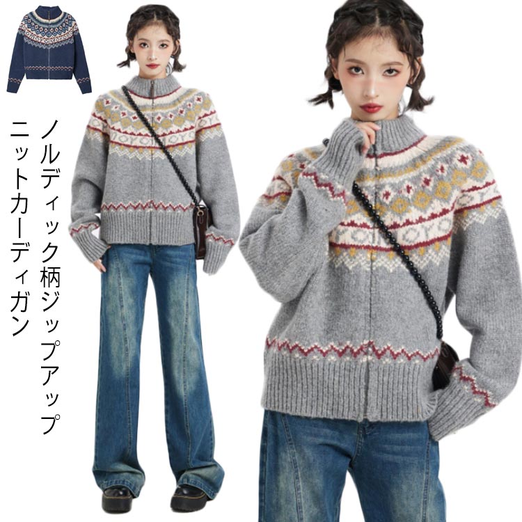 ニット ノルディック柄 レディース ニットトップス セーター ジップアップ 前開き 長袖 トップスレディースファッション トップス ニット セーター セーター