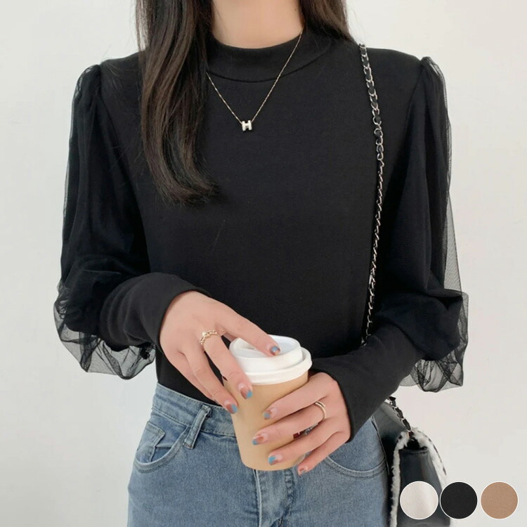 カットソー レディース トップス 韓国 シャツ 長袖 チュール ドッキング バルーン袖 オフィス ハイネック 上品 バルーンスリーブ 異素材 ランタンスリーブ 秋冬 秋 冬 春 大人 無地 黒 白