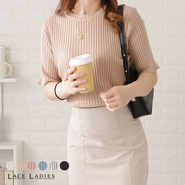 5分袖 サマーリブニット トップス レディース ホワイト ブラック ブルー ピンク 大人可愛い 五分袖 半袖 春 春夏 夏 サマーニット ネック オフィス フェミニン きれいめ