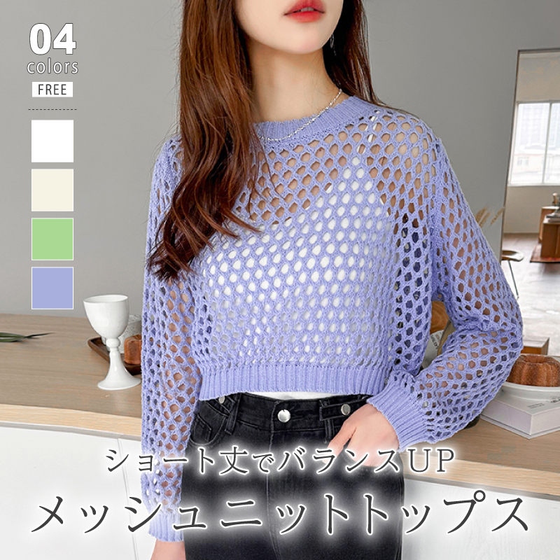 メッシュニット トップス 透かし編み ショート丈 メッシュ ニット レディース クルーネック ショート 丈 透け感 重ね着 メッシュトップス 長袖 メッシュ編み プルオーバー ざっくりニット サマー