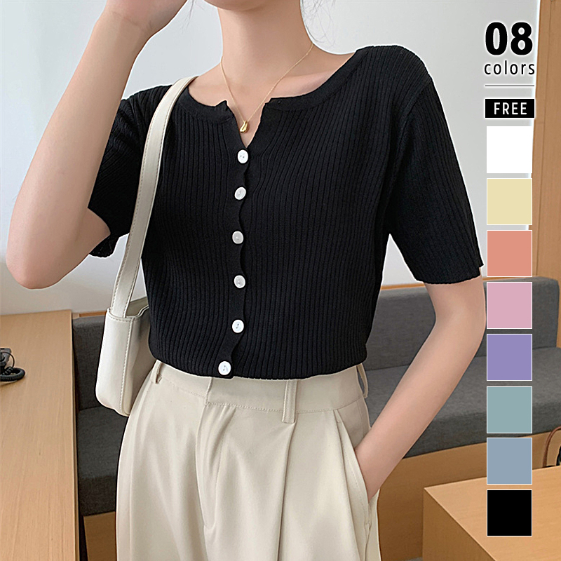 トップス サマーニット レディース 個性的 半袖 Vネック 無地 黒 白 ピンク 黄色 緑 春 夏 秋 上品 きれいめ おしゃれ シンプル カジュアル ナチュラル フェミニン エレガント