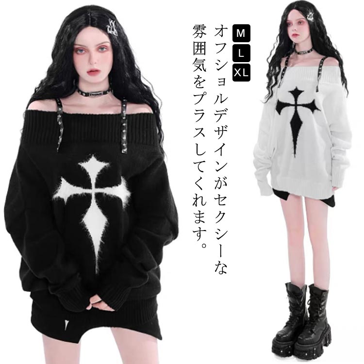 セーター ニット レディース 肩出し 地雷系 長袖 クロスプリント ゴスロリ 病みかわいい 柔らかい サブカル系 パンク 原宿風 薄手 セクシー 春 秋 ボートネック