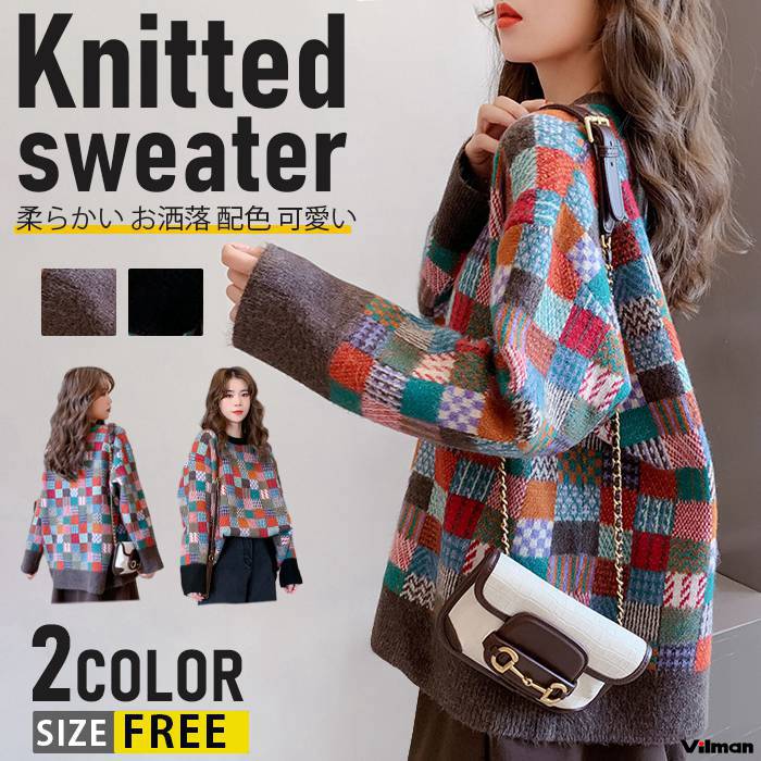ニット セーター レディース ニットセーター チェック柄 トップス 秋 冬 チュニック ニットソー プルオーバー