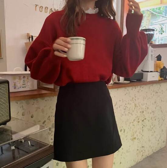 トップス セーター プルオーバー ツーピース レースエッジ襟 スタンドカラー 長袖 萌袖 レギュラー丈 ボトムス スカート ミニスカート ショート丈 通勤 通学 OL かわいい きれいめ
