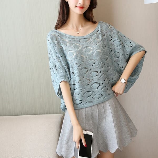 無地 ドルマンスリープ 五分袖 カジュアル シンプル トップス 青 黄 桃 白 らくだ プルオーバー ゆったり 体型カバー 透かし編み 薄手 大人 カジュアル 春 夏 5色 華奢に見える