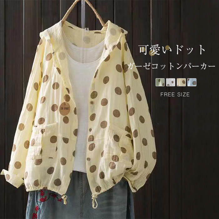 ガーゼ パーカー レディース 長袖 ダブルガーゼ パーカー 総柄 ドット ボタン ガーゼパーカー ガーゼカーディガン 前開き フード付き シャツ ブラウス 羽織 はおり 白 ホワイト