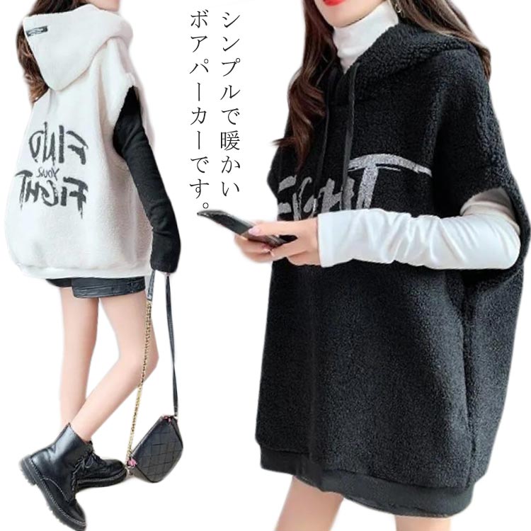 ビッグシルエット パーカー レディース フード付き ボアベスト 袖なし ゆったり 秋冬 おしゃれ もこもこ 保温 防寒 カジュアル 英字プリント