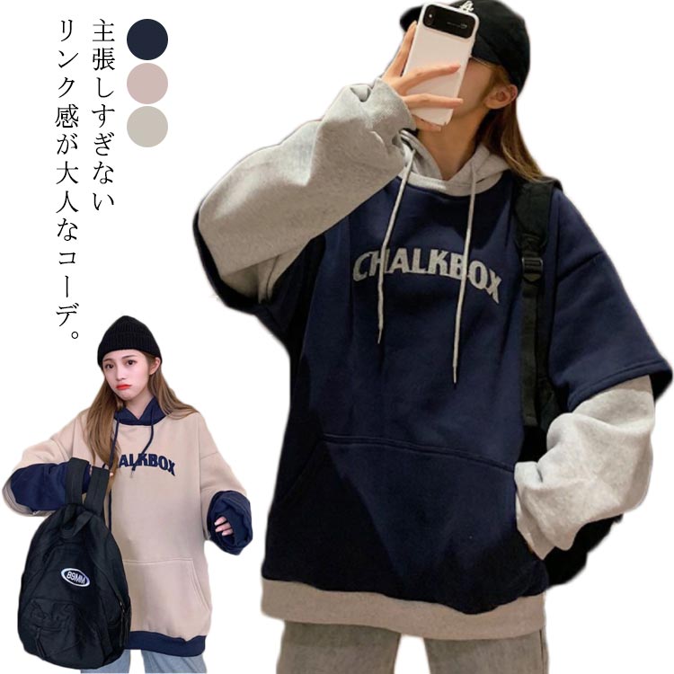 バイカラー アウター 秋服 ヒップホップ スウェットパーカー 体型カバー 偽二件 韓国風 パーカー 秋冬 S M L XL 2XL