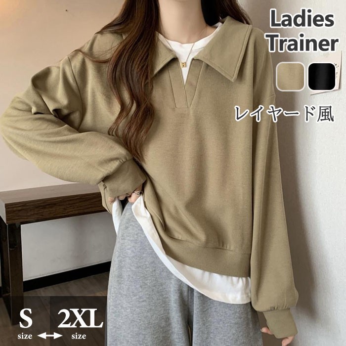 ポロシャツ トレーナー 長袖 レイヤード風 重ね着風 フェイクレイヤード プルオーバー シンプル 無地 スウェット フードなし ボリューム 抜け感 体型カバー レディース パーカー 春秋 トップス ジ