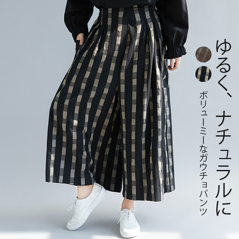 チェック柄ワイドパンツ 9分丈 体型カバー ゆったり ガウチョパンツ チェック パンツ ふんわり ゆったりシルエット タックパンツ カジュアル リラックス ナチュラル