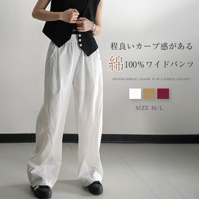 カーブパンツ レディース 綿100% 春 夏 ワイドパンツ イージーパンツ 無地 上品 きれいめ 体型カバー 着痩せ 美脚 通勤 仕事 カジュアル リラックス ウエストゴム 総ゴム