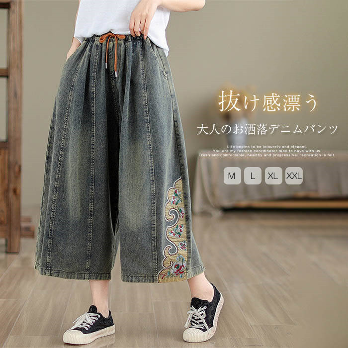 ワイドパンツ レディース デニム ガウチョパンツ デニムワイドパンツ 夏 秋 春 大きいサイズ ゆったり ボトムス 春夏 デニムパンツ 切り替え 花柄 刺繍 イージーパンツ 体型カバー