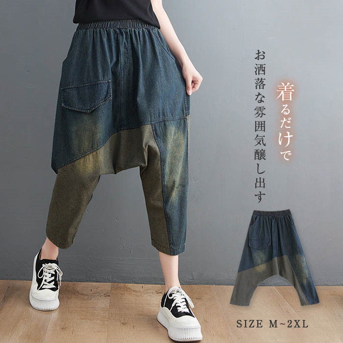 デニムパンツ レディース デニム パンツ レディース サルエルパンツ デニム サルエル 春 夏 秋 ボトムス 体型カバー 8分丈 切り替え ゆったり おしゃれ