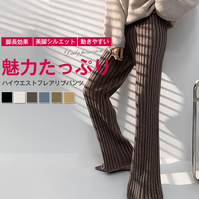 リブニットパンツ レディース フレアパンツ ボトムス リブニット ゆるパンツ リラックス 楽ちん ロングパンツ フレアパンツ