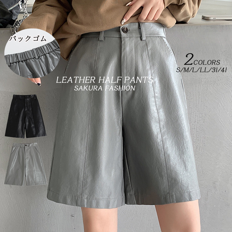 フェイクレザーハーフパンツパンツ レディース ボトムス ズボン ハーフパンツ ショートパンツ ウエストゴム ゆったり 秋冬 レザーショートパンツ
