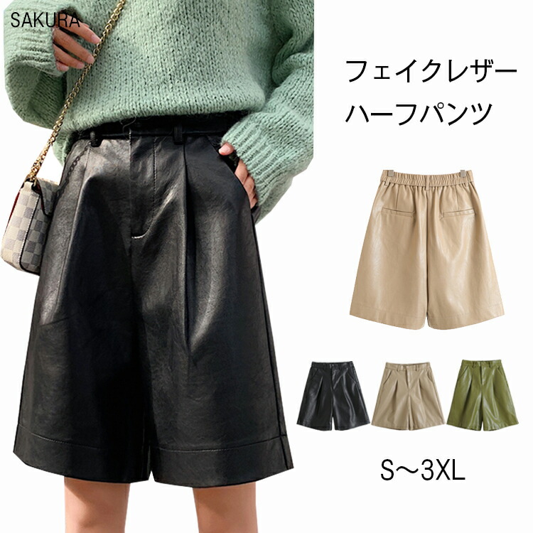 パンツ フェイクレザー レディース ボトムス ズボン 半ズボン 短パン ショーパン ショート丈 膝上 ひざ上 ハーフパンツ ミニ丈 短め レザーパンツ ウエストゴム