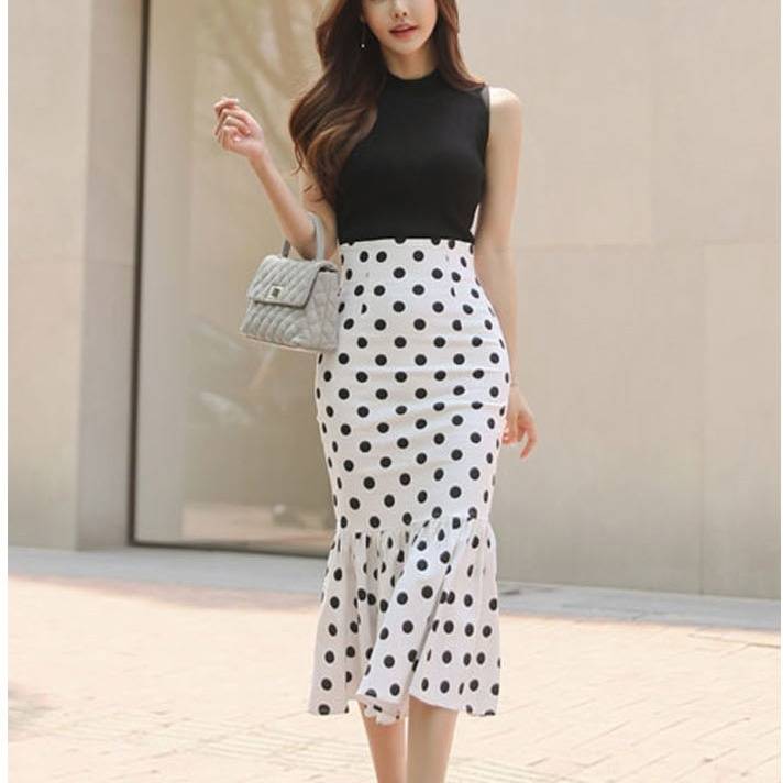 スカート レディース マーメイド ミモレ丈 春 夏 ドット柄 水玉 ブラック ホワイト 2色展開 フレア タイト ハイウエスト 休日 お出かけ デート コーデ 女子会 普段使