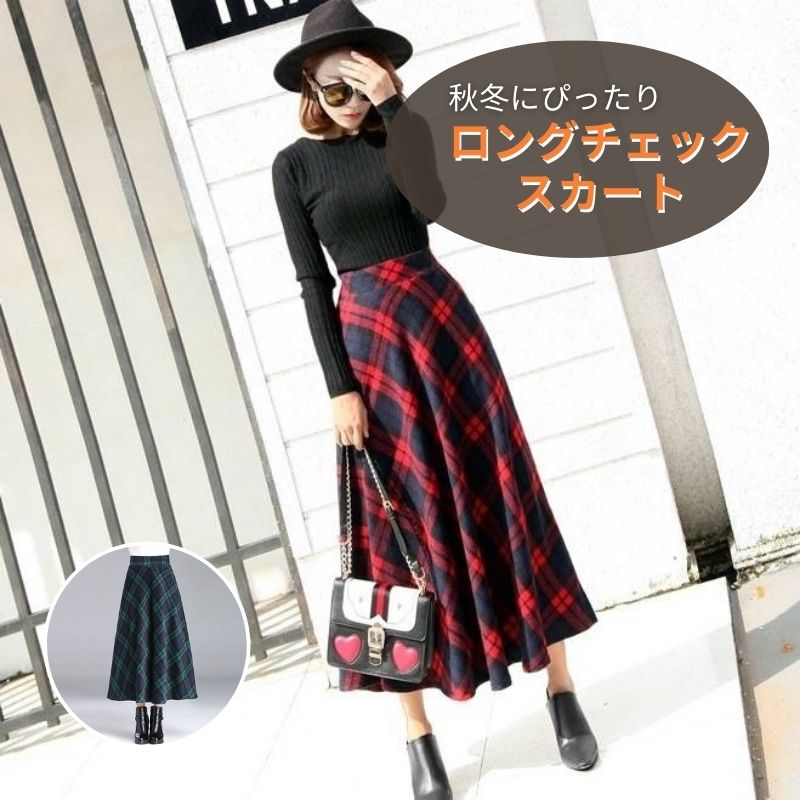 ロング スカート レディース 秋 冬 チェック柄 レッド グリーン 2色展開 Aライン フレア ハイウエスト ウエストマーク 休日 お出かけ デート コーデ 普段使い 着回し