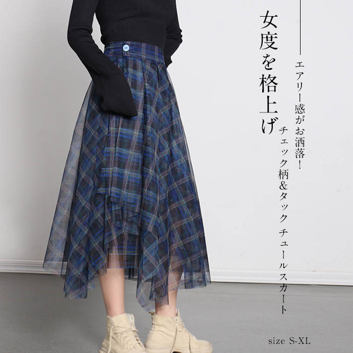 アシンメトリーチュールスカート スカート レディース チェック フレアスカート ロング マキシスカート アシンメトリー 大人 Aライン 春 秋 夏