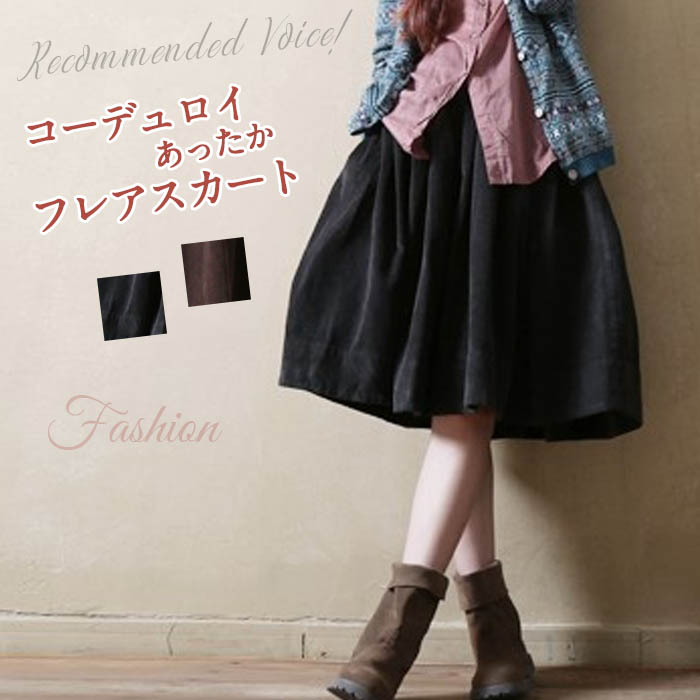 スカート レディース ボトムス 膝丈 ひざ丈 フレアスカート フレア Aラインスカート コーデュロイスカート ウエストゴム ゴム 大きいサイズ ゆったり 無地 秋冬