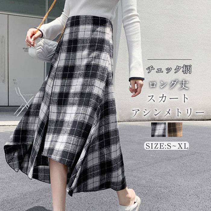 チェック スカート ロング 冬 レディース Aライン アシンメトリー 秋冬 スカート 大きいサイズ 秋 冬 ロング丈 フレアスカート aライン ハイウエスト ミモレ丈 着痩せ