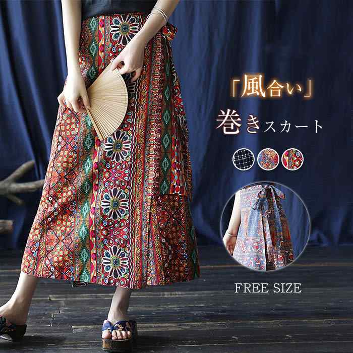 スカート レディース ロング 春夏秋 コットン リネン ボトムス 春 夏 秋 ロングスカート 巻きスカート ラップスカート 柄スカート ロング丈 ガラ aライン ドッキング 20代 30代 40代 5