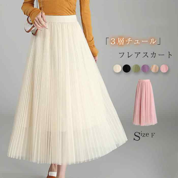 チュールスカート レディース 春 秋 夏 ロングスカート ボトムス 春夏 フレアスカート ロング ロング丈 ウエストゴム プリーツ 裏地付き Aライン フレア 無地 3層チュール