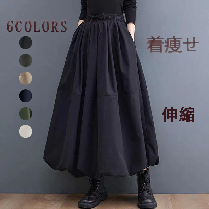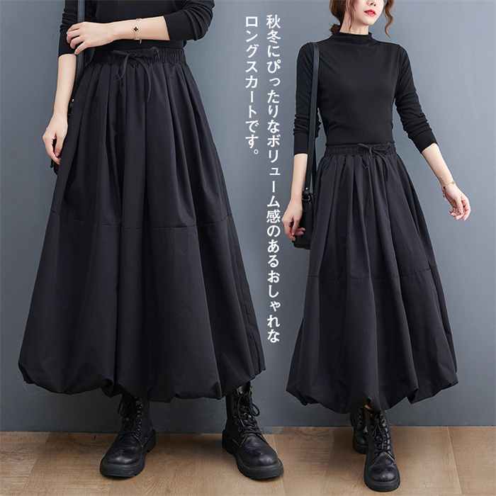 ロングスカート レディース 秋冬 プリーツ ウエストゴム 体型カバー ゆったり ボリュームスカート バルーンスカート 黒