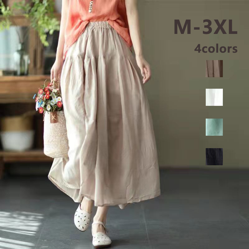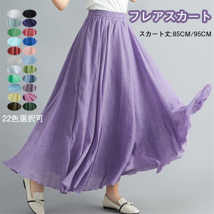 フレアスカートフリーサイズ ミモレ丈 ウエストゴム 綿麻素材 22色選択可 S Mレディースファッション ボトムス スカート