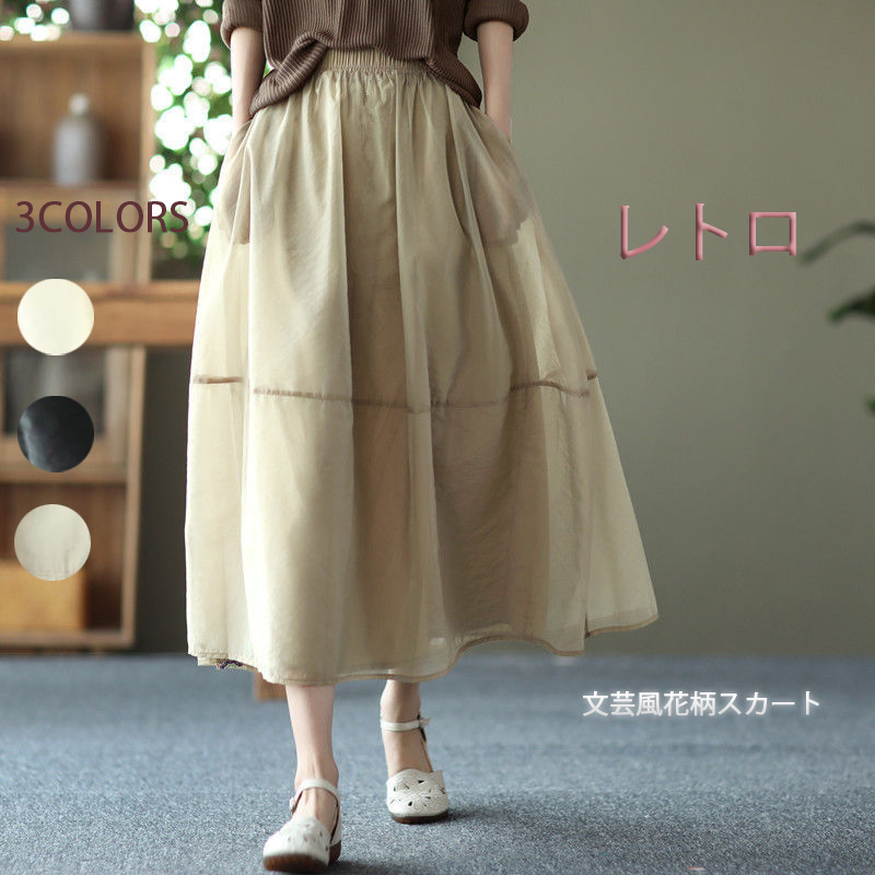ロングスカート レトロ 文芸風花柄スカート ポケット ベージュ ブラック カーキ 肌によい裏地 ボトム 20代 30代 40代 50代 春 夏