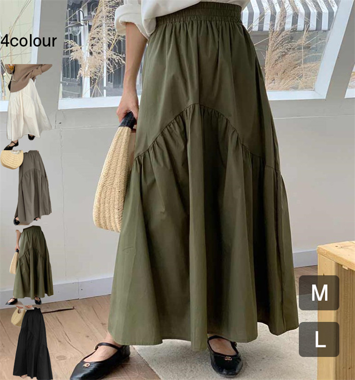 ロングスカート レディース 春夏秋 プリーツ ウエストゴム ゆったり ボリュームスカート バルーンスカート スカート ホワイト ブラック グレー アーミーグリーン M L