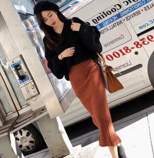セットアップ プルオーバー タイトスカート ニットスカート トップス スカート ボトムス ミモレ丈 袖あり 長袖 ボリューム袖 萌袖 ランタンスリーブ Vネック スリム ハイウエスト