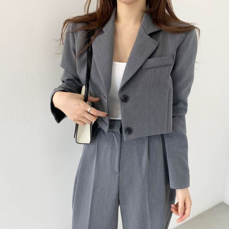 クロップドジャケット&センタープレスパンツスーツ セットアップ レディース 春 秋 上下 ツーピース スーツ 個性的 パンツスーツ クロップド丈 ロングパンツ