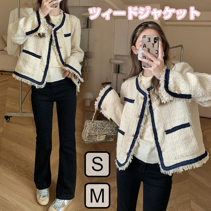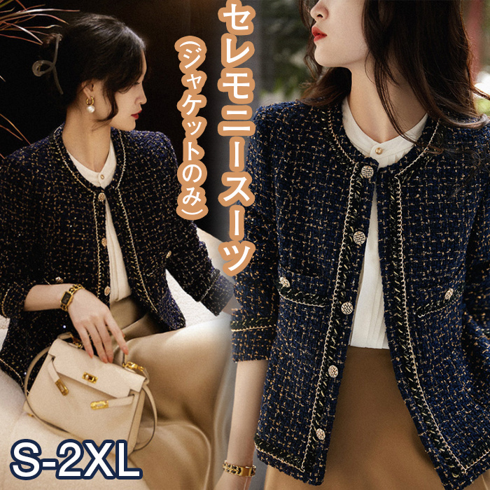 セレモニースーツ ツィードジャケット ノーカラージャケット レディース アウター ツイード 金釦 金ボタン 通勤 オフィス カジュアル ママスーツ 結婚式 卒業式 入学式 卒園式 S M