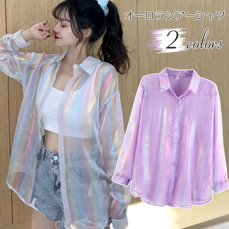 シャツ ブラウス シースルー 2カラー トップス シアーシャツ オーロラ 透け感 光沢レディースファッション トップス その他