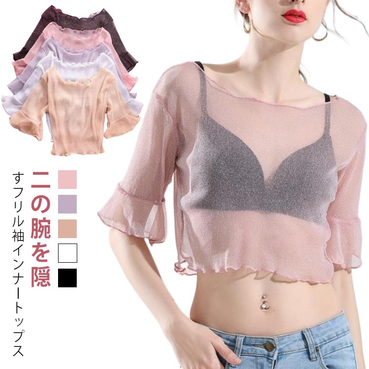 5分袖 レディース シアートップス 大きいサイズ インナートップス プルオーバー ノースリーブ用 付け袖 ラメ S~2XL 重ね着 体型カバー 二の腕隠し つけ 袖 肌着 tシャツ