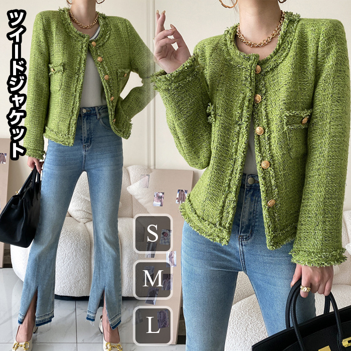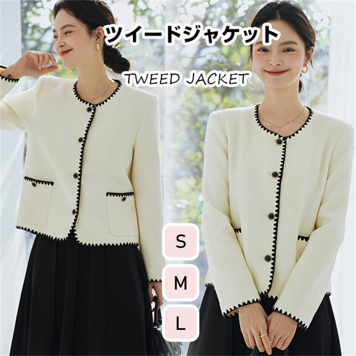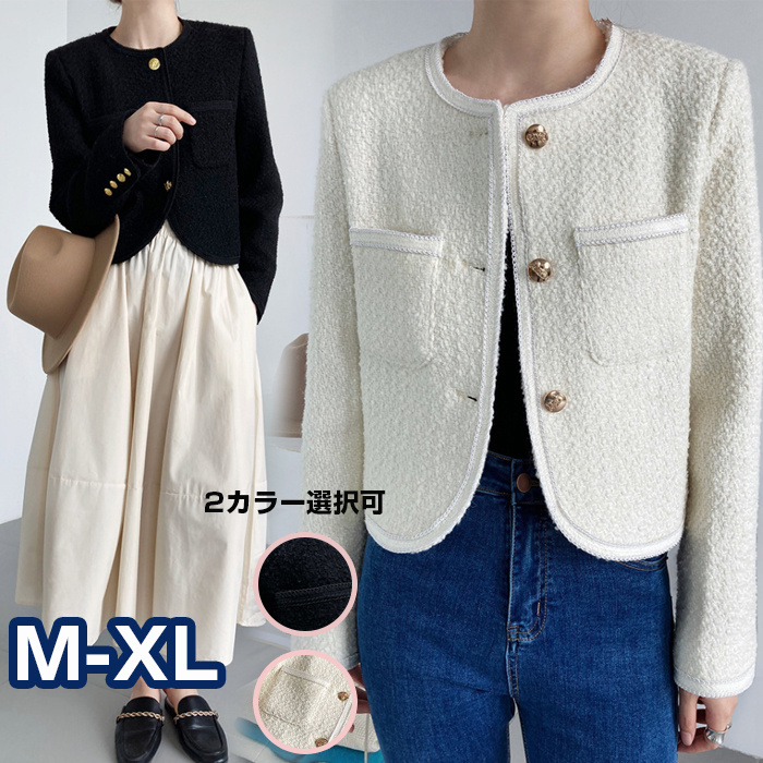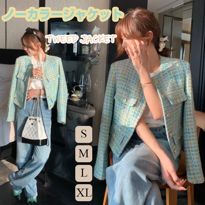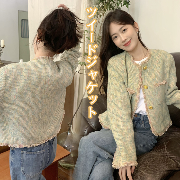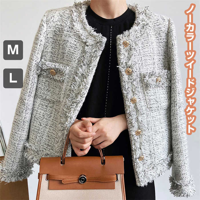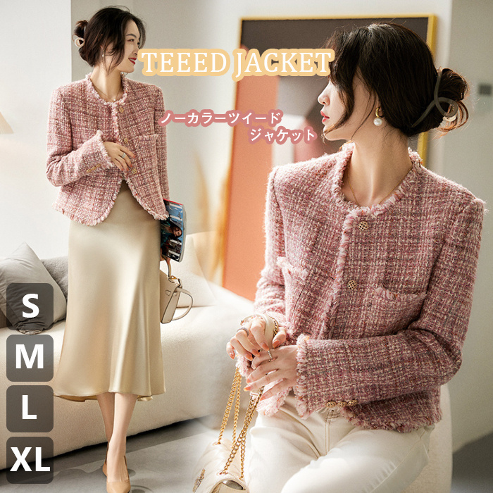 ツイードジャケット レディース 長袖ノーカラージャケット ショット丈ツイードコート 春コートアウター 秋服 大人韓国風 通勤 オフィス 結婚式 入学式 卒業式 30代 50代